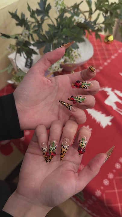 This Lilith Press-On Nails set features warm orange leopard-print bases, paired with bold 3D glossy cherry accents—blending wild, alluring charm (echoing Lilith’s iconic mystique) with playful sweet flair, perfect for retro-themed