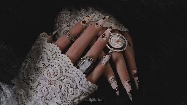 Featuring sheer nude bases splashed with moody burgundy blobs, tiny black specks, and glinting gold metallic studs, this set marries edgy art-flecked chaos with luxe, eye-catching texture.